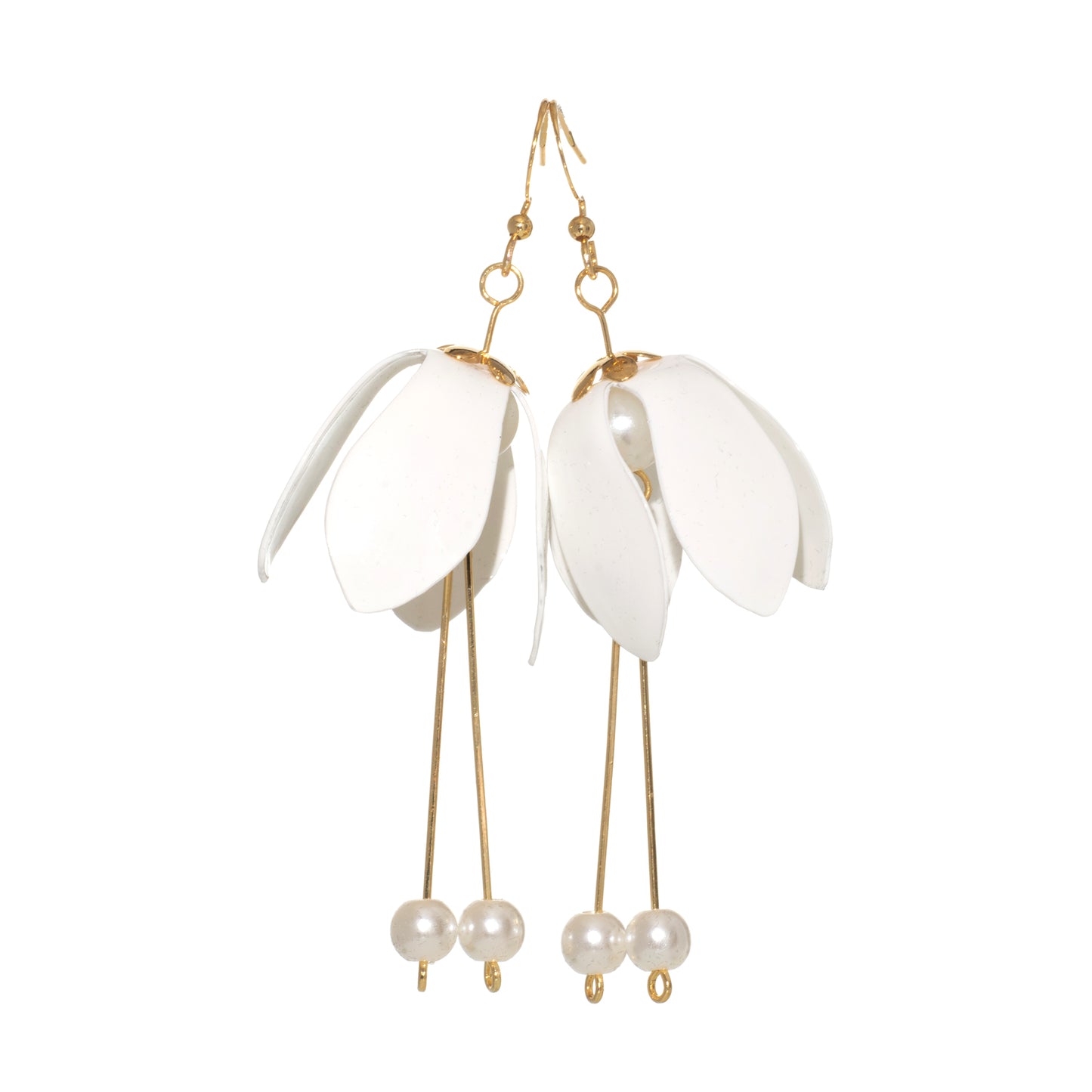 Delicate yet bold, these handmade earrings feature an upside-down lily flower design with clear petals, a soft white bead, and two drops that sway gently as you move.